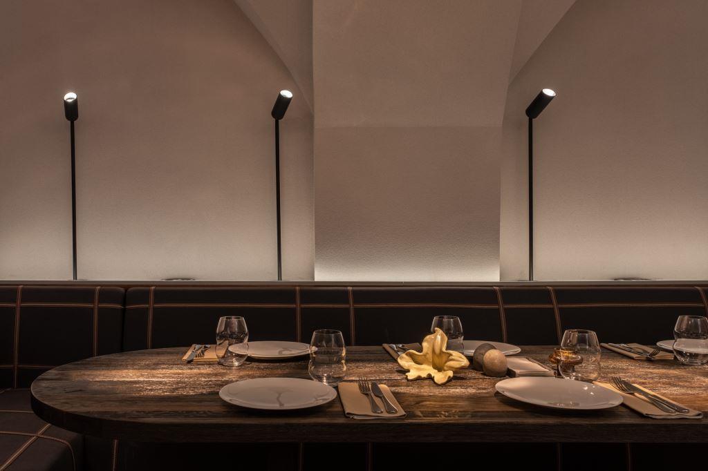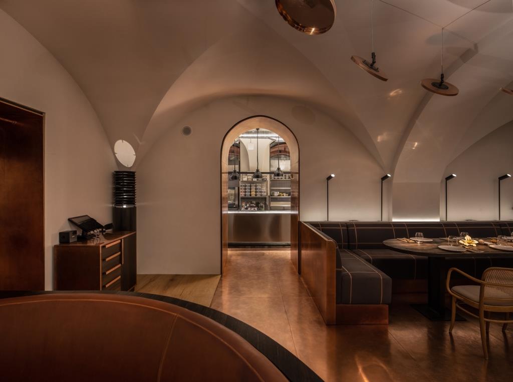 La calda presenza del rame è protagonista anche dei sistemi di illuminazione, in cui le fonti luminose vengono riflesse da dischi sospesi a soffitto e disposti a raggera intorno ai tavoli creando una luce calda e soffusa che dona agli ambienti una suggestiva e accogliente atmosfera.