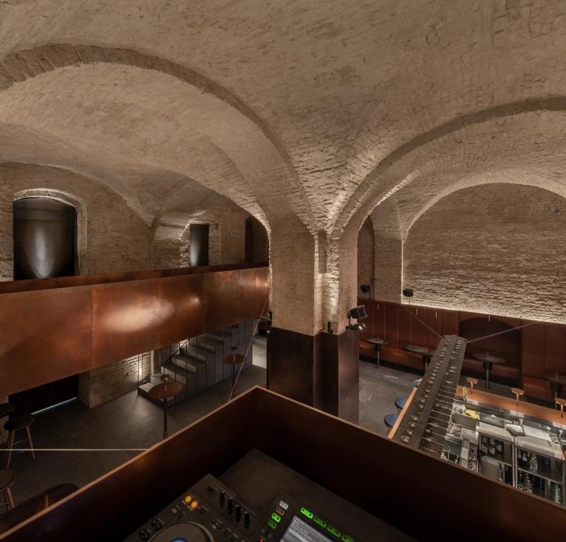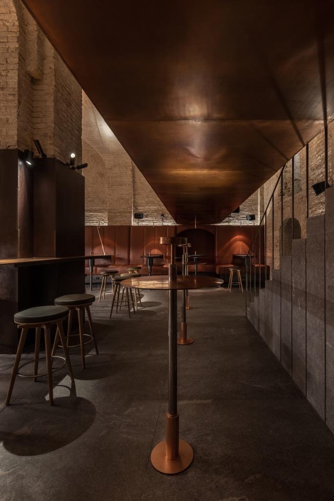 Un’ampia sala con postazione DJ e un mixology bar sovrastata da una passerella in rame è il luogo ideale per dopocena all’insegna del relax e della socialità. La scelta del rame non è casuale ed enfatizza la forte personalità degli spazi, tracciando con lineare rigore le forme essenziali del bancone bar, della consolle e di un’originale struttura sospesa tramite cavi in acciaio.