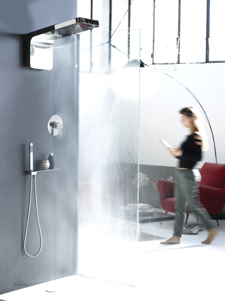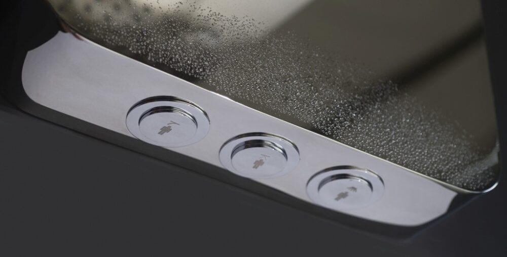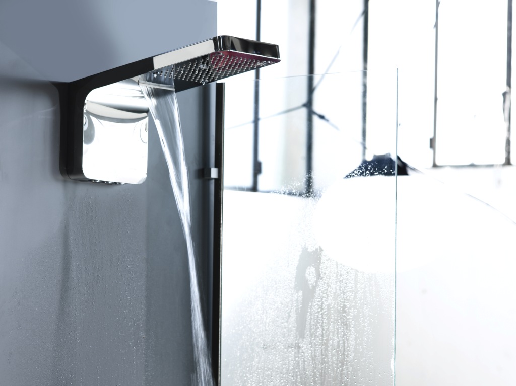 Inoltre, è possibile installarlo al posto di un soffione pre-esistente, trasformando un vecchio impianto monogetto o a due vie in una doccia “all in one” che, in un’unica soluzione di design, racchiude la piacevolezza di tre getti d’acqua. È così possibile fare la doccia scegliendo il getto desiderato semplicemente selezionandolo con il deviatore a pulsante posto sotto la base del pannello.