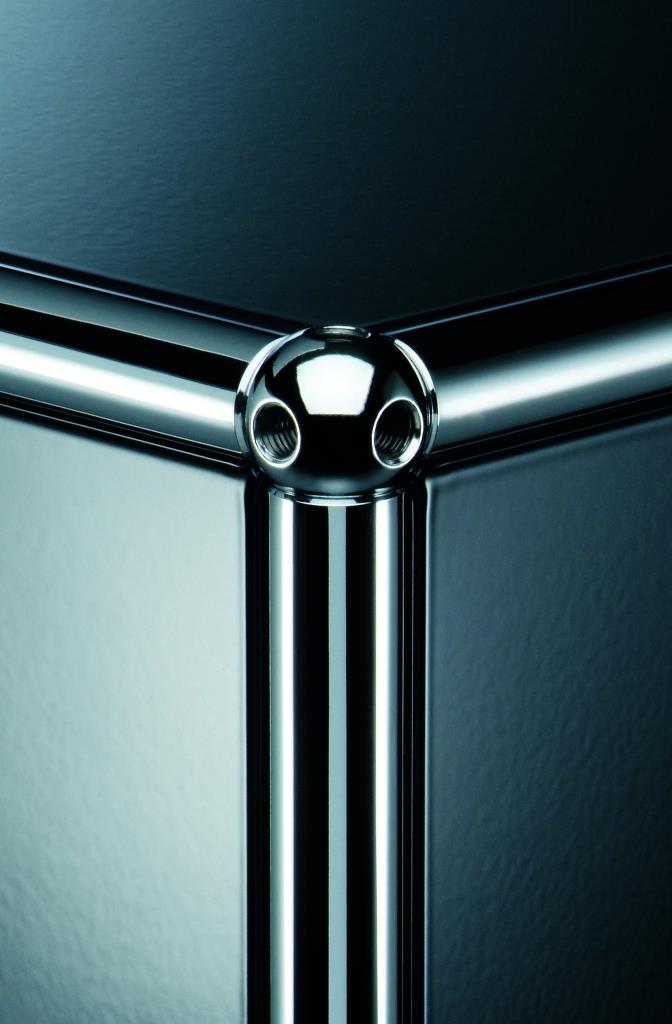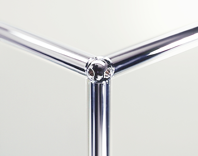 Il sistema d’arredo USM Haller consiste in pochi elementi metallici: tubi, un giunto sferico e pannelli in lamiera verniciati a polvere. Il giunto – la nostra sferetta in ottone cromato da 25 millimetri – è il vero protagonista: il sistema può essere percepito come un insieme di linee e superfici grazie al fatto che la sfera è solo trascurabilmente più grande dei tubi. Come in ogni opera dove è importante la tettonica – ovvero il principio secondo cui tutte le forme risultano modellate dalle leggi della statica e dalla qualità dei materiali – è l’elemento di giunzione a rendere ragione delle qualità estetiche del manufatto.