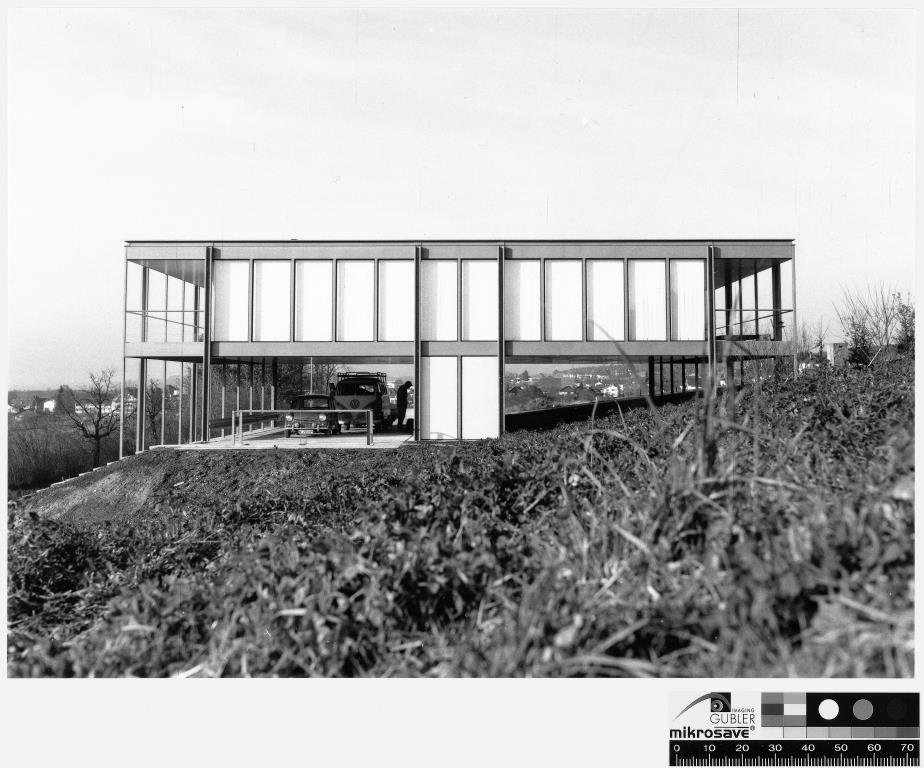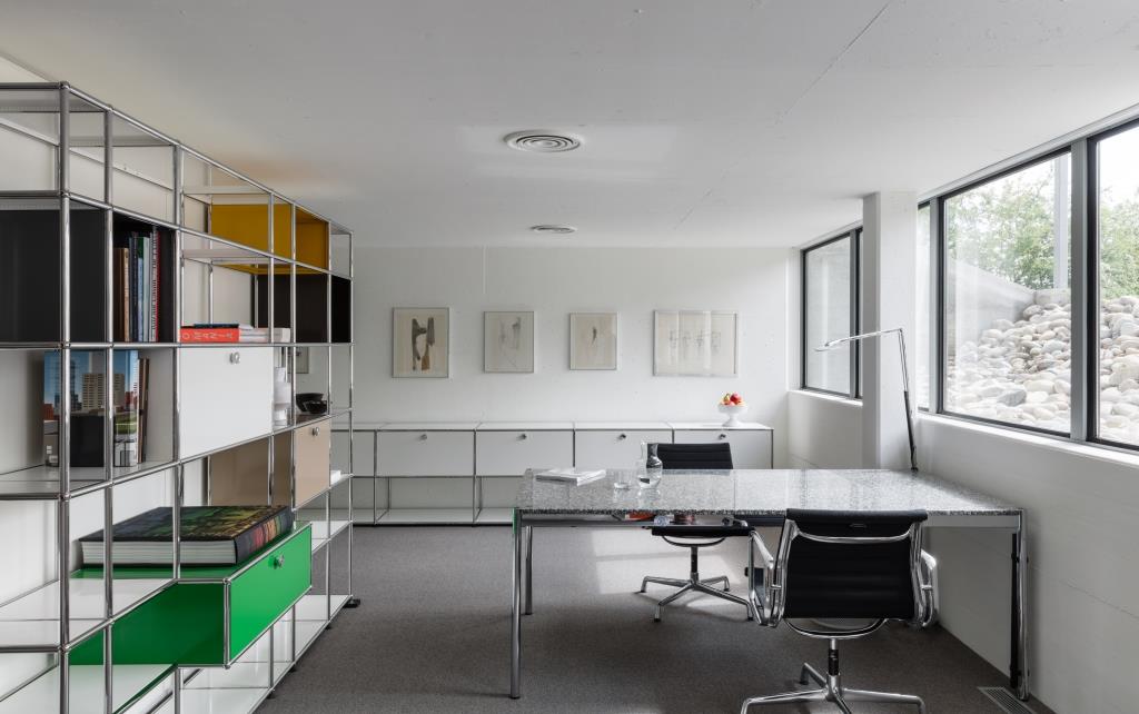 Realizzato lo stabilimento, Fritz Haller e Paul Schärer concepiscono nel 1963 una linea di mobili, pensata in un primo momento per soddisfare le esigenze dell’azienda, che verrà prodotta in serie dal 1969 e diventerà un’icona del design. Sempre nel 1969 Fritz Haller completa, su una collina nelle immediate vicinanze dello stabilimento, la residenza privata della famiglia Schärer, conosciuta come Buchli – “breve e dolce” dal nome del terreno in lingua svizzero tedesca – realizzata con il sistema USM Haller MINI. L’edificio si affaccia sui locali dell’azienda ed è costruito su una griglia strutturale con ritmo 2:5:2:5:2. Al piano terra, prevalentemente aperto, il modulo centrale accoglie l’ingresso con la scala a chiocciola, che sbarca al piano superiore in fronte alla cucina. Su questo livello si sviluppano da un lato le camere, dall’altro la sala da pranzo e il soggiorno, mentre al piano seminterrato si trovano un ufficio e la camera per gli ospiti. Il volume è scandito dalla larghezza – 1,20 metri – delle finestrature.