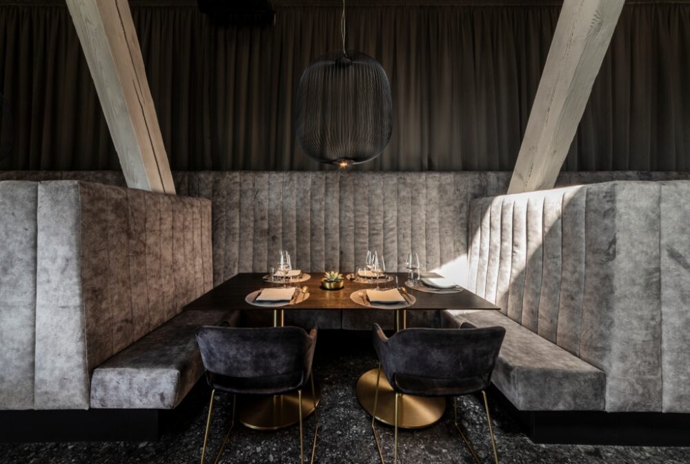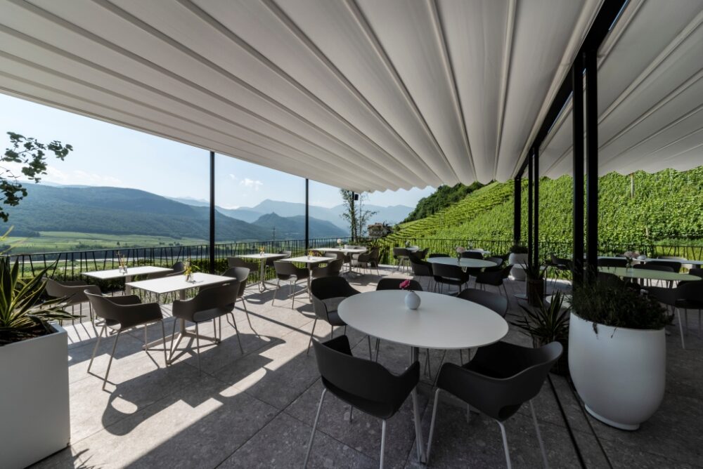 Il progetto del locale è stato curato dallo studio di architettura Bergundtal di Brunico: un elegante ingresso conduce a una grande terrazza esterna immersa nel verde e allestita con arredi Pedrali contemporanei e versatili.