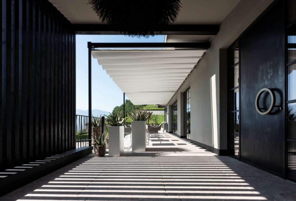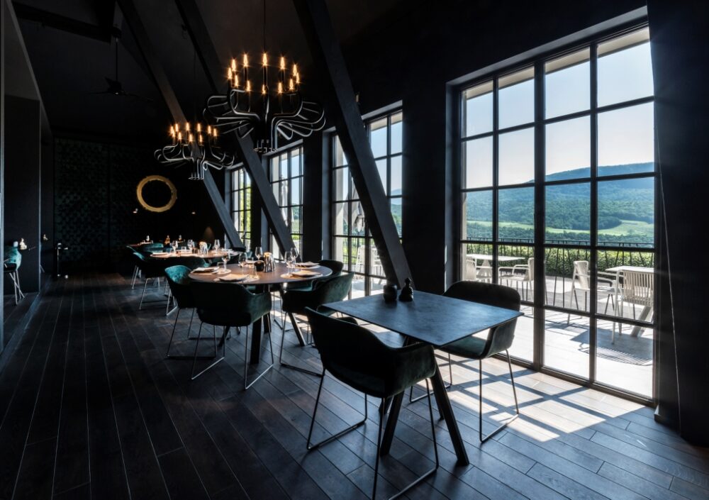 L’interno è caldo e accogliente, caratterizzato dai toni del grigio e del marrone all’ingresso del cocktail bar e da tinte più scure per la sala ristorante, mentre grandi finestre favoriscono l’ingresso della luce naturale permettendo inoltre di ammirare il panorama circostante che offre un’esclusiva vista sulle colline e sul vicino specchio d’acqua.