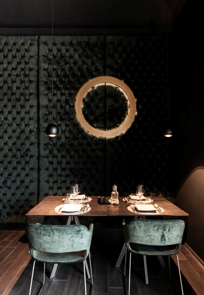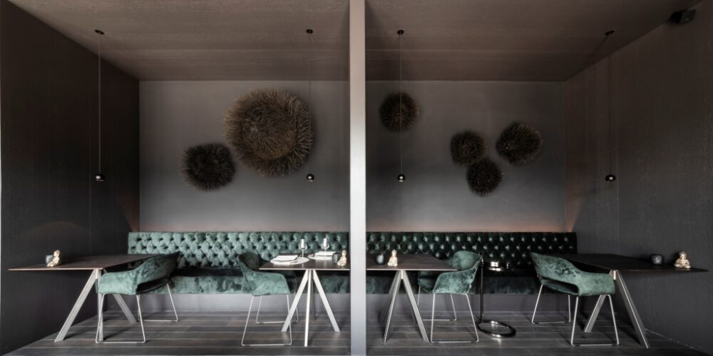 Le soluzioni d’arredo Pedrali rimandano a un mood ricercato e di tendenza. Il verde smeraldo delle poltrone imbottite Babila conferisce alla sala ristorante maggiore eleganza e dialoga con lo spazio definendo un’ambientazione confortevole. Un look più industriale è invece suggerito dai tavoli Arki-Base con base centrale e da Arki-Table, che si inseriscono perfettamente all’interno dell’allestimento.